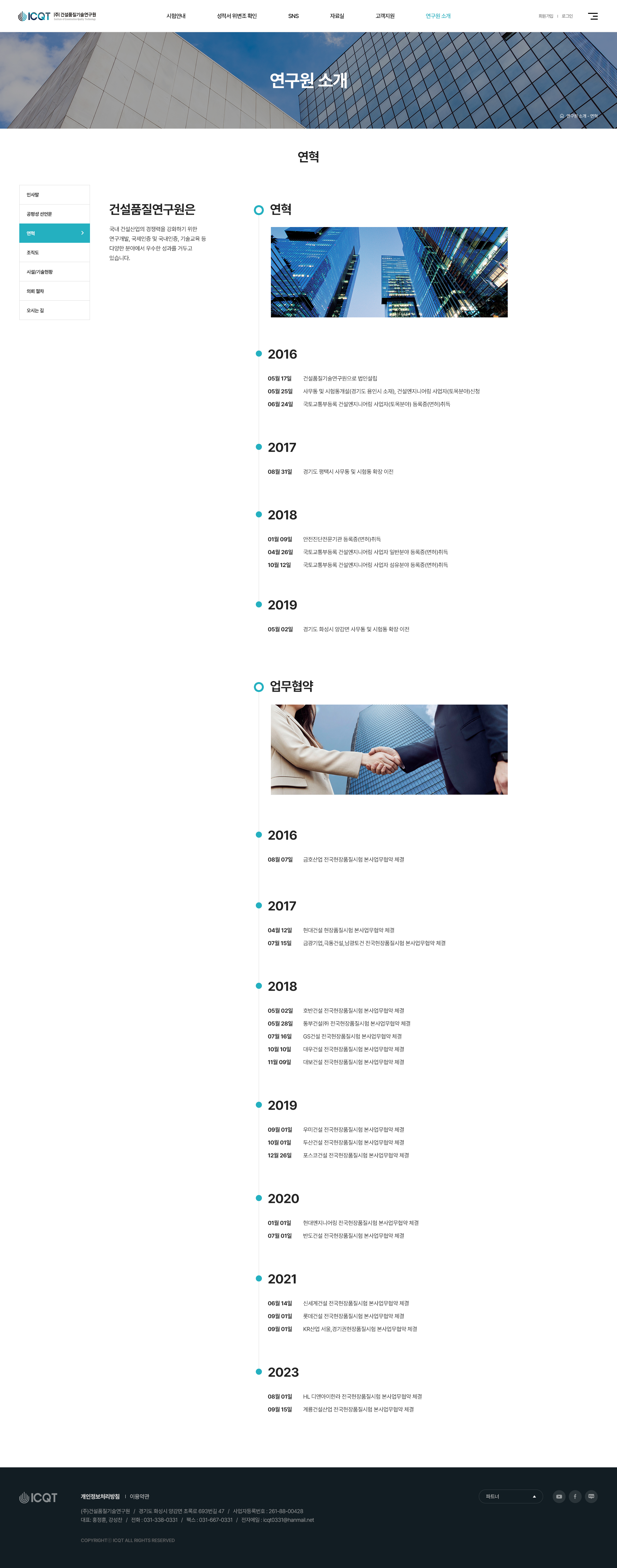 ㈜건설품질기술연구원 웹사이트 구축 프로젝트는 토목·건축 분야 시험기관의 전문성과 품질 신뢰를 온라인에서 명확히 전달하기 위해 개발된 반응형 홈페이지 제작 사례입니다. 2016년 설립 이후 건설 현장의 품질시험과 기술사고 예방을 최우선 가치로 삼아 온 기관의 정체성이, 국내 사용자가 어떤 화면 환경에서도 일관되게 탐색·이해되도록 정보 구조와 반응형 웹사이트 제작에 집중했습니다. 센터 소개, 시설 기술 현황, 성적서 위변조 검증 안내, 연구원 구성과 같은 핵심 콘텐츠가 과한 연출 없이도 자연스럽게 연결되는 UX 흐름으로 구현되었으며, 신뢰 기반의 기업 홈페이지 전문 제작 업체의 개발 역량이 담긴 구축 레퍼런스로 완성되었습니다.