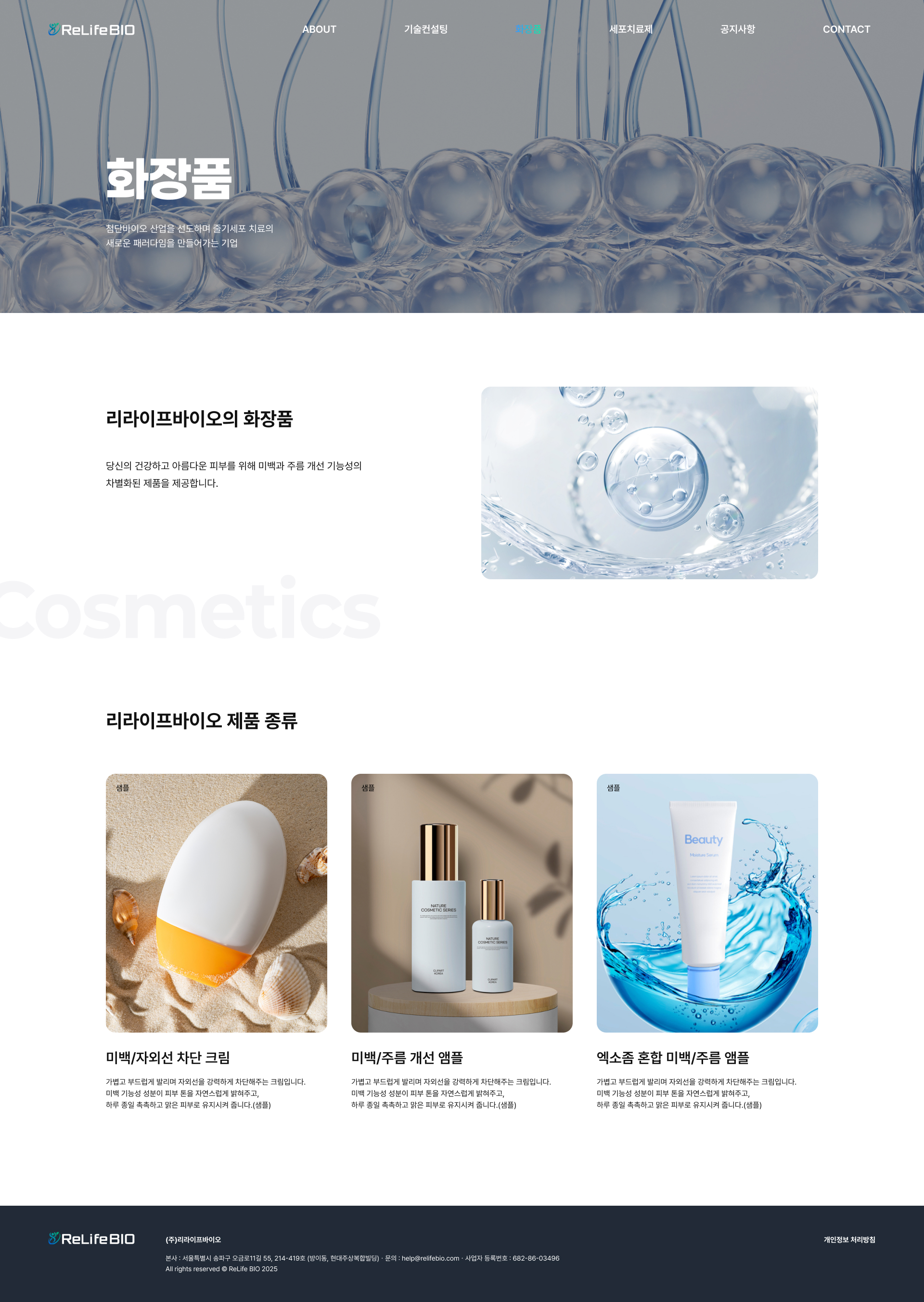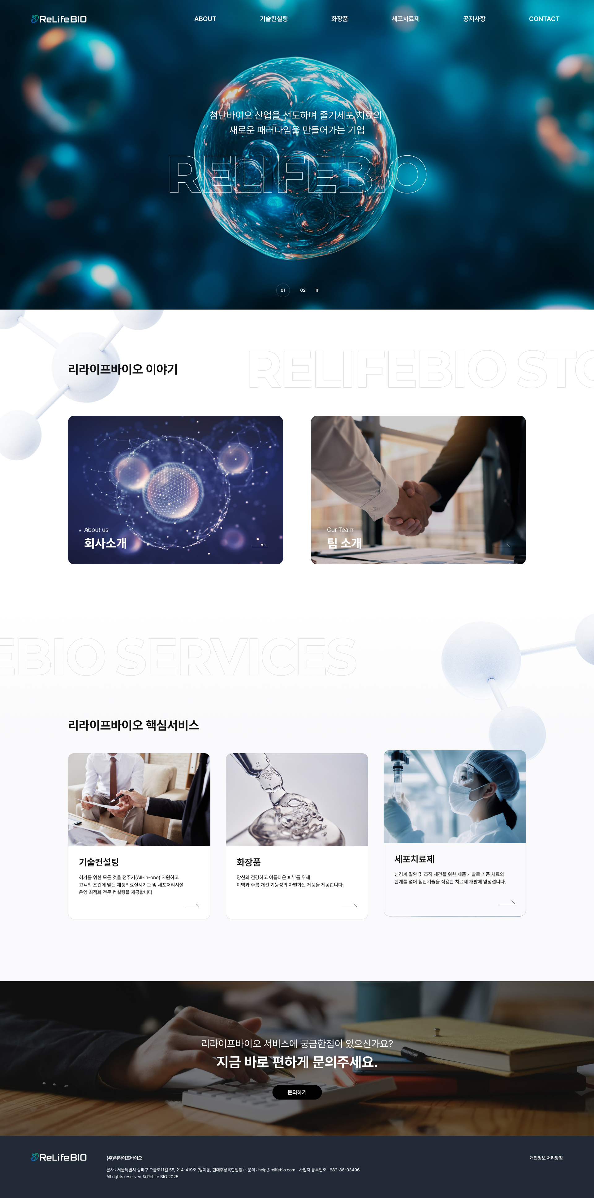 리라이프바이오 공식 홈페이지는 첨단재생의료 분야에서 임상연구 인허가 컨설팅과 첨단바이오의약품 개발 지원을 수행하는 바이오 전문 기업의 비전과 역량을 전달하는 공식 웹사이트입니다. 본 프로젝트는 세포치료제와 조직공학제제 분야에서 축적된 연구·임상 경험과 전문성을 명확히 전달하고, 병의원과 연구기관이 사업 범위와 지원 내용을 직관적으로 이해할 수 있는 디지털 환경을 구축하기 위해 진행되었습니다. 기존 기업 소개와 기술·지원 정보가 분산되어 전달되던 구조적 한계를 진단하고, 회사 소개부터 솔루션·제품·지원사업 안내까지 전반적인 UI/UX 구조와 콘텐츠 구성을 정비했습니다. 이를 통해 리라이프바이오의 전문성과 신뢰도를 일관되게 전달하고, 첨단재생의료 생태계를 지원하는 바이오 기술 중심의 통합 디지털 플랫폼으로 구축되었습니다.