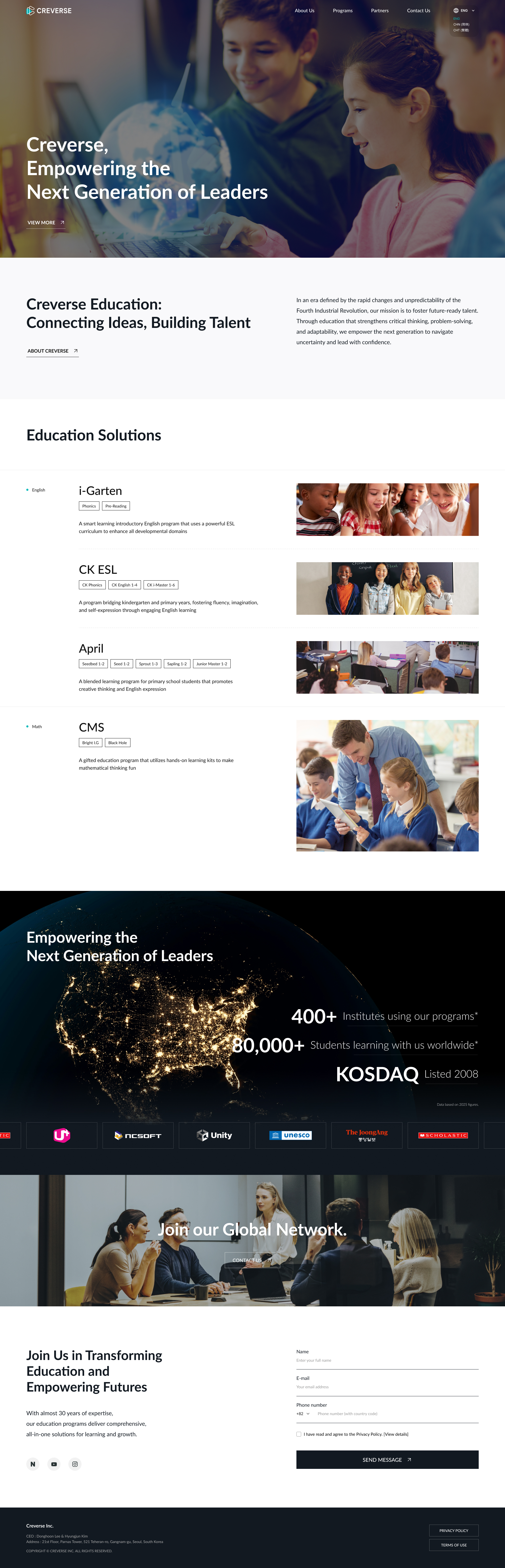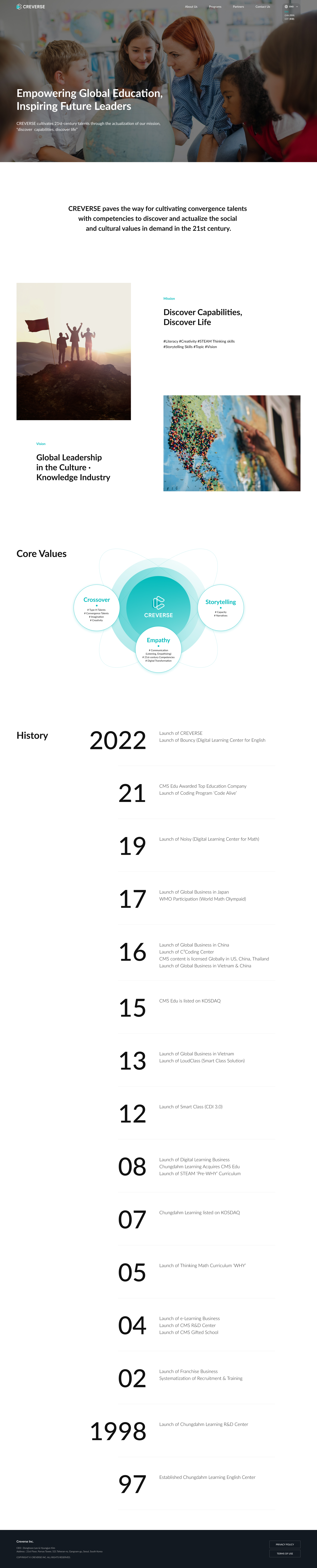 크레버스 글로벌 공식 홈페이지는 21세기 인재 양성을 목표로 글로벌 교육 비전과 프로그램을 전 세계에 전달하는 교육 기업의 공식 웹사이트입니다. 본 프로젝트는 ‘Discover Capabilities, Discover Life’라는 미션과 글로벌 리더십 비전을 명확히 전달하고, 다양한 교육 프로그램과 파트너십 가치를 직관적으로 이해할 수 있는 디지털 환경을 구축하기 위해 진행되었습니다. 기존 브랜드 메시지와 프로그램 정보가 분산되어 전달되던 구조적 한계를 진단하고, 프로그램 소개부터 회사 및 글로벌 파트너 소개까지 전반적인 UI/UX 구조와 콘텐츠 구성을 정비했습니다. 이를 통해 크레버스가 지향하는 교육 철학과 문화·지식 산업 내 글로벌 경쟁력을 일관되게 전달하는 글로벌 교육 중심의 통합 디지털 플랫폼으로 구축되었습니다.