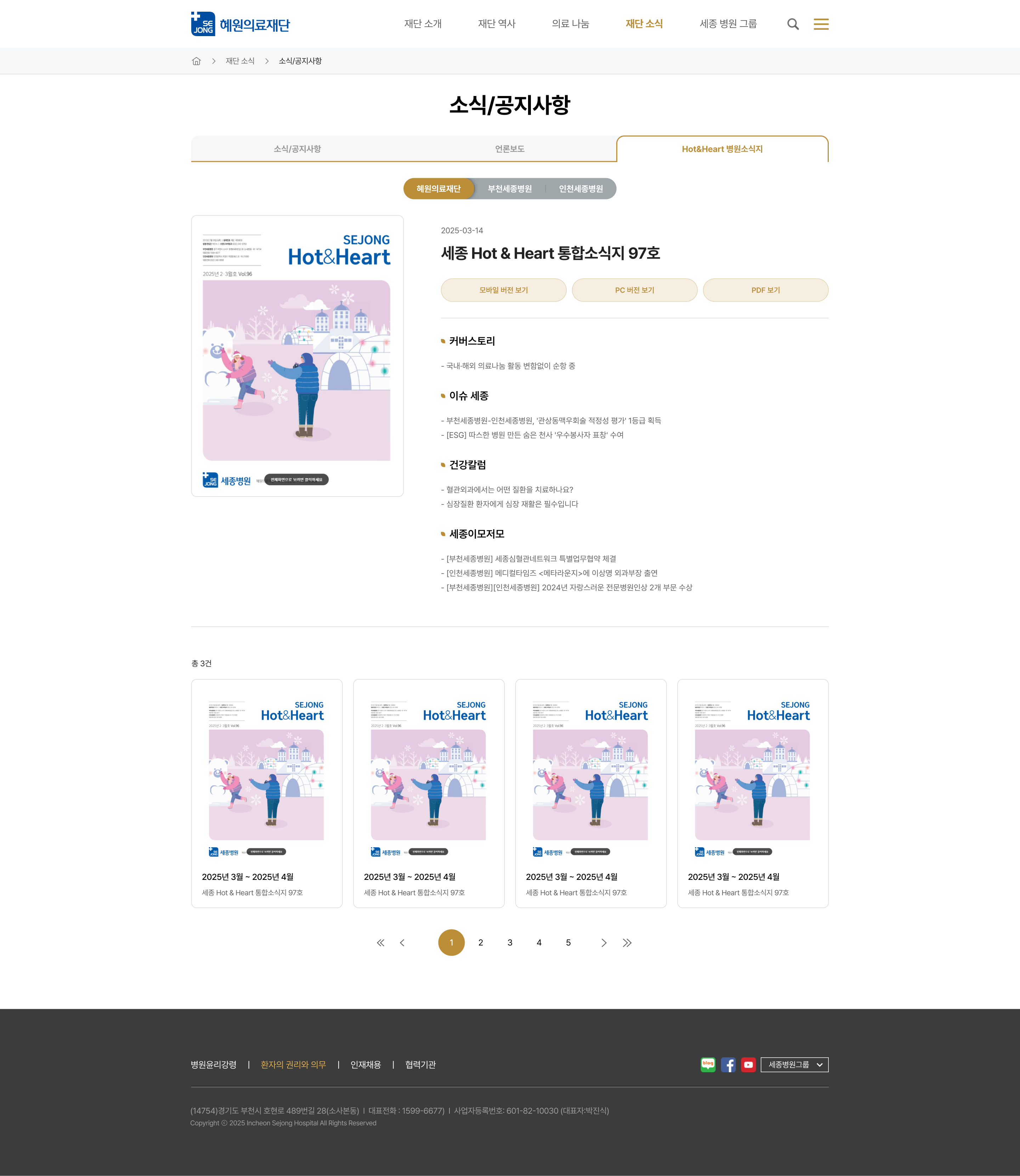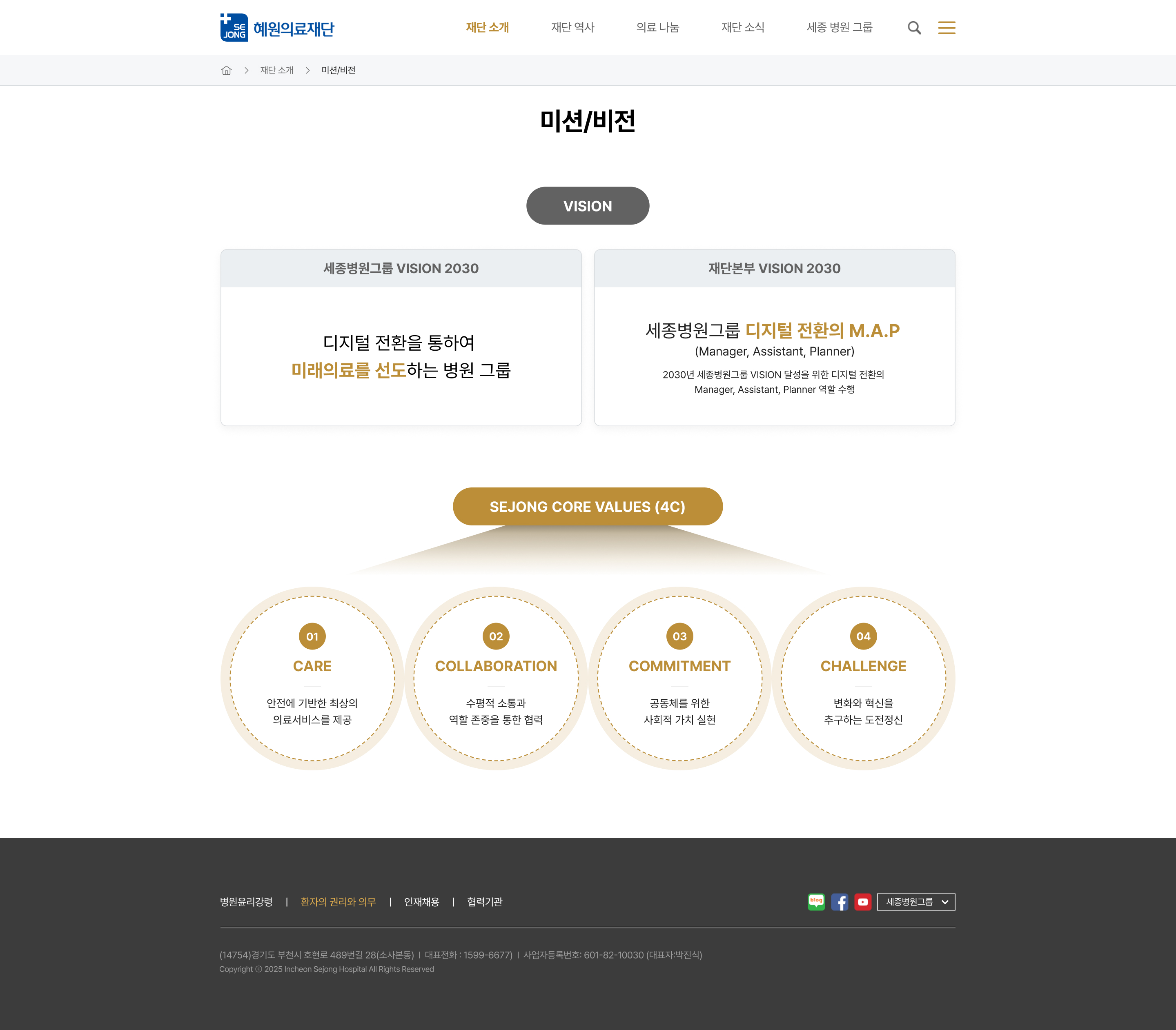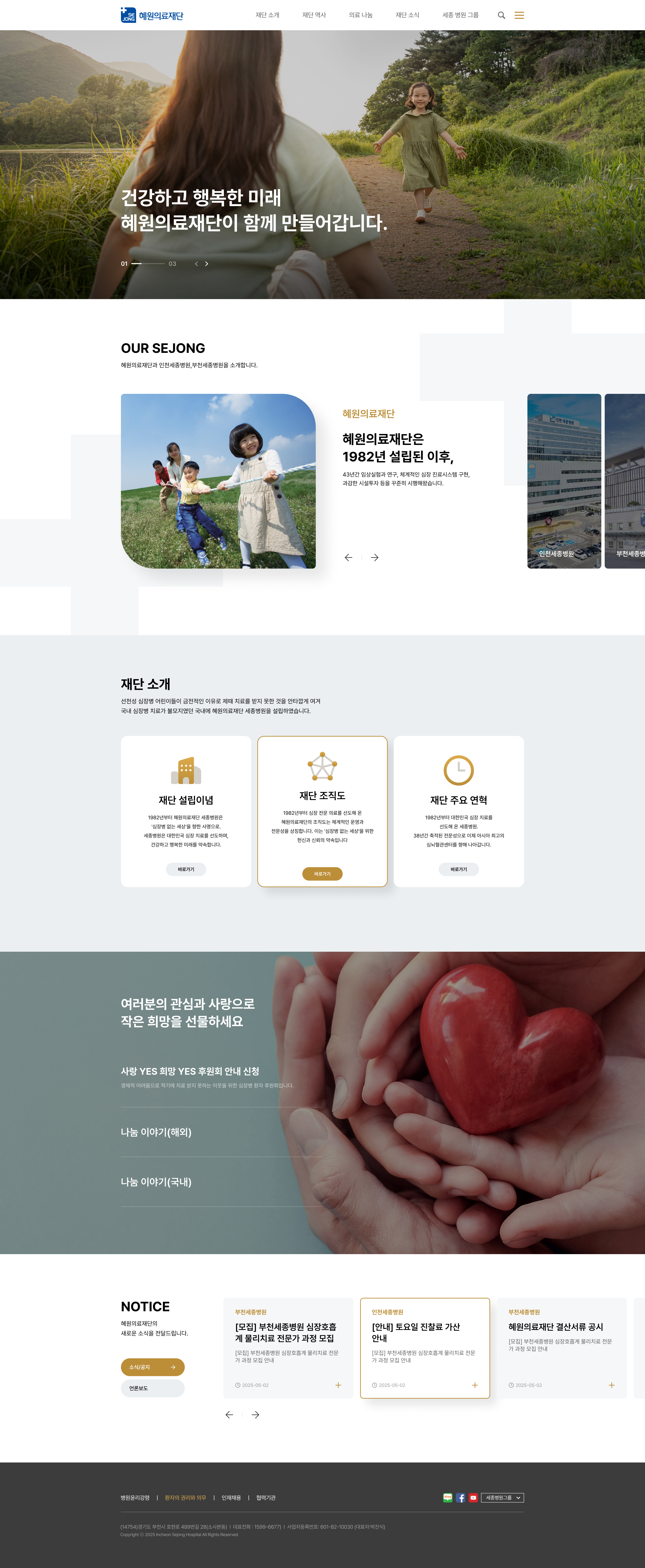 ‘심장병 없는 세상’을 이념으로 1982년 설립된 혜원의료재단과 세종병원의 설립 배경, 심장 의료 발전을 이끌어 온 연구·진료 성과, 인천세종병원 개원으로 이어지는 확장 과정이 자연스럽게 이어지도록 콘텐츠를 구성했습니다. 특히 의료 기술 성과, 주요 연혁, 재단의 미션과 비전이 한눈에 이해될 수 있도록 계층 구조를 단순화해 사용자 접근성을 높였습니다.