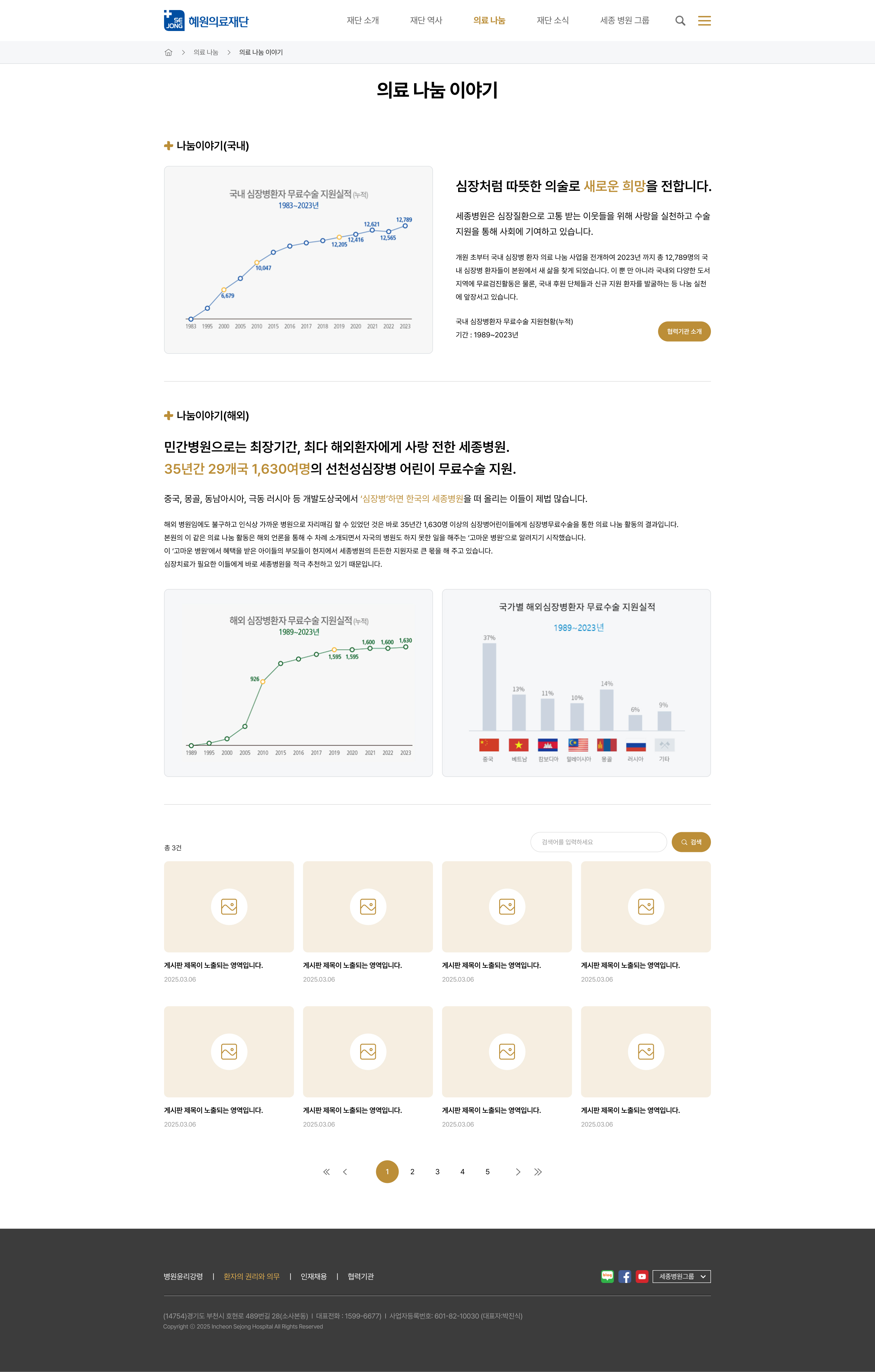 의료 나눔 이야기 섹션은 수치와 사실 중심으로 정리해 공공성과 신뢰성을 강화했으며, 재단 소식과 주요 연혁은 지속적인 활동 흐름이 드러나도록 구성했습니다. 이를 통해 의료기관의 전문성뿐 아니라 사회적 책임과 지속 가능한 의료 가치가 함께 전달되도록 설계했습니다.